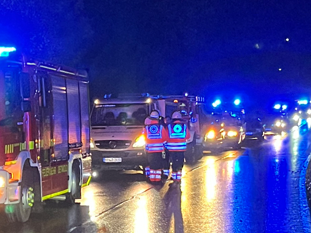 Um 21:21 Uhr ging der Alarm bei den Ehrenamtlichen ein. Zehn Minuten später rückte der KTW der Einsatzeinheit als erstes Fahrzeug in Richtung Detmold aus. Ihm folgten noch der FüKW, der ortsvereinseigene KTW und der Betreuungskombi. Letzterer wurde zusätzlich durch die Leitstelle angefordert, um die Betroffenen im leichten Nieselregen trocken unterbringen zu können.